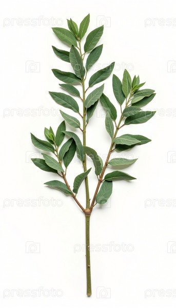 Свежая зеленая лавровая ветвь с несколькими листьями на белом фоне