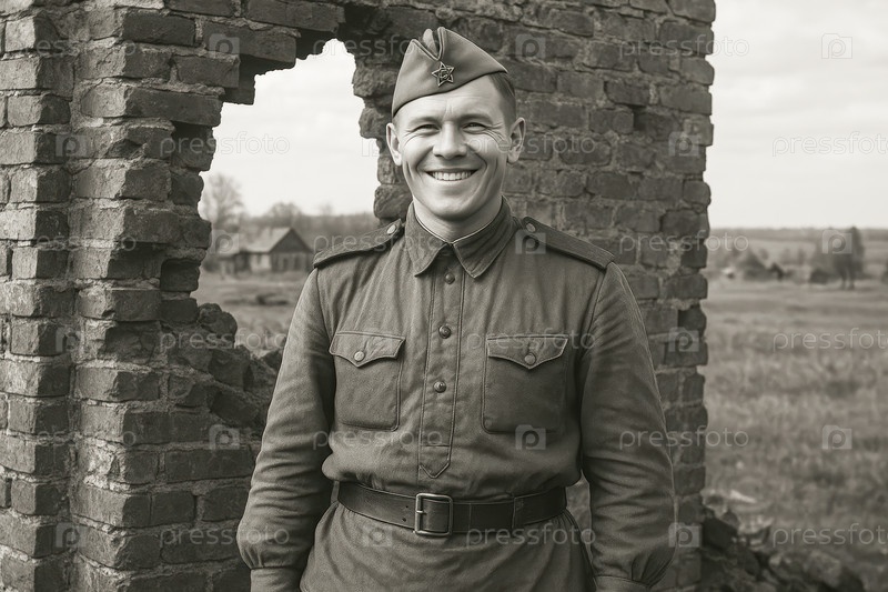 Советский солдат в пилотке времен второй мировой войны на фоне разрушенной кирпичной стены