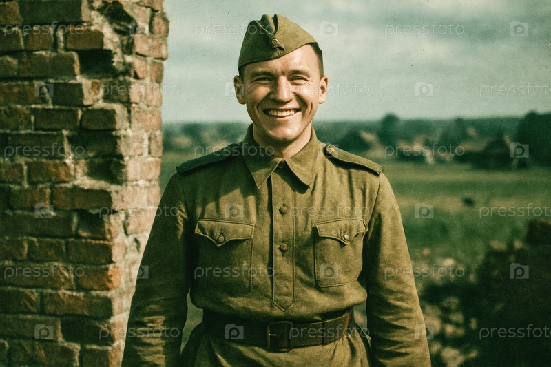 Советский солдат в пилотке времен второй мировой войны на фоне разрушенной кирпичной стены