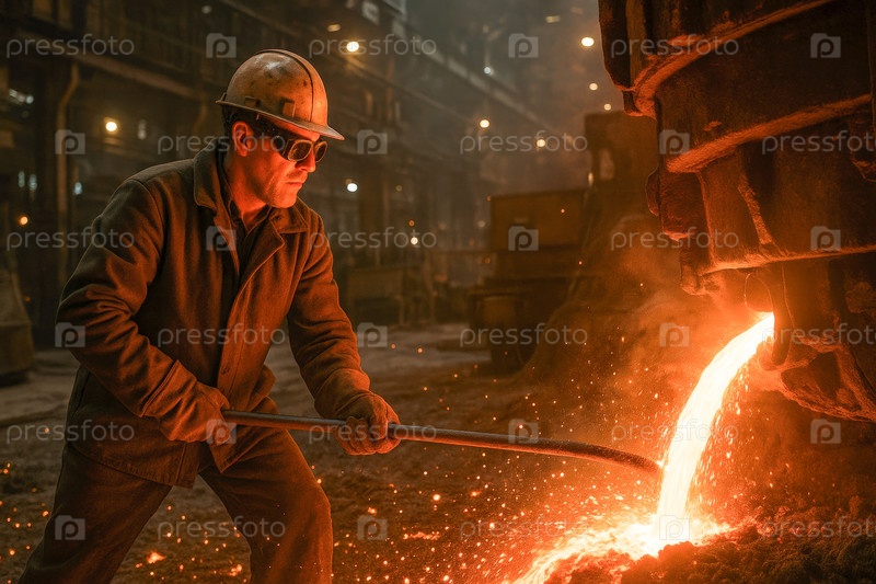 Металлург работает с расплавленным металлом в производственном цехе металлургического завода