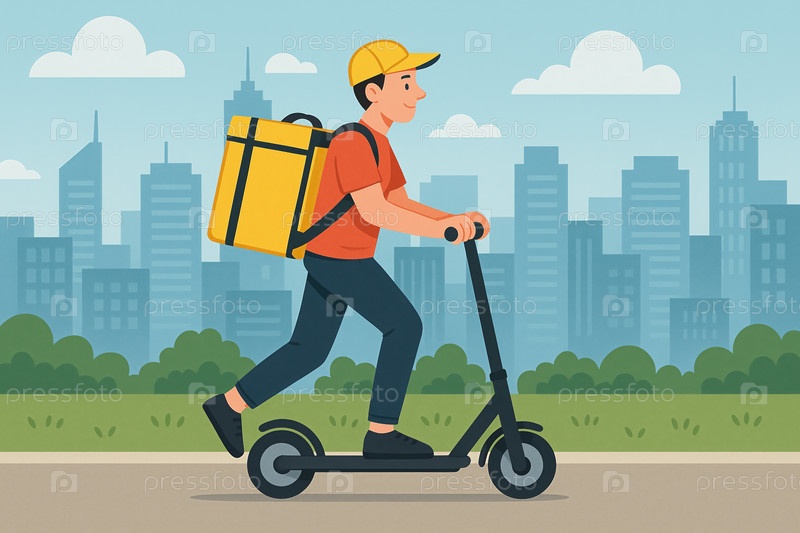 Курьер на самокате везет продукты в желтой термосумке на фоне города