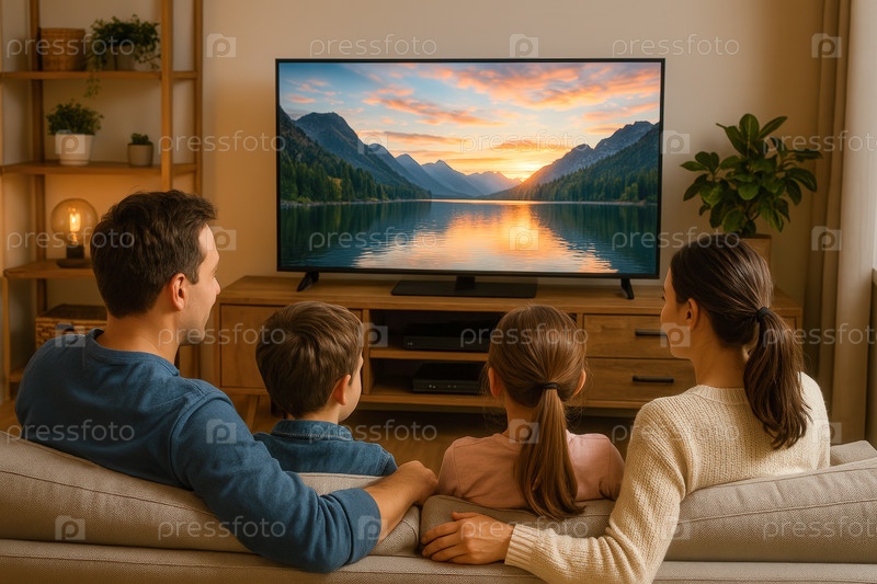 Семья смотрит телевизор в гостиной