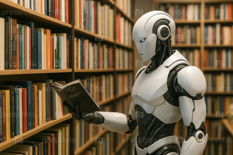 Робот держит в руке книгу в библиотеке как символ машинного обучения и электронной библиотеки. Оцифровка книг и архивных материалов