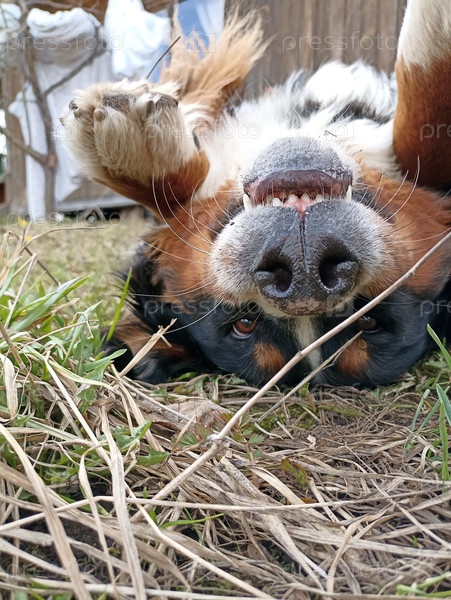 Собака лежит на спине, вверх лапами и смотрит в камеру