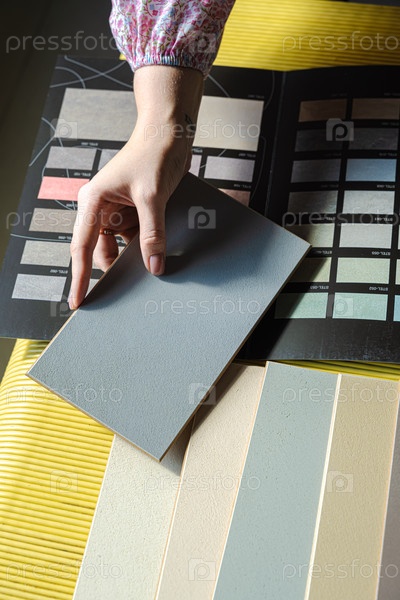Девушка дизайнер выбирает краску из каталога