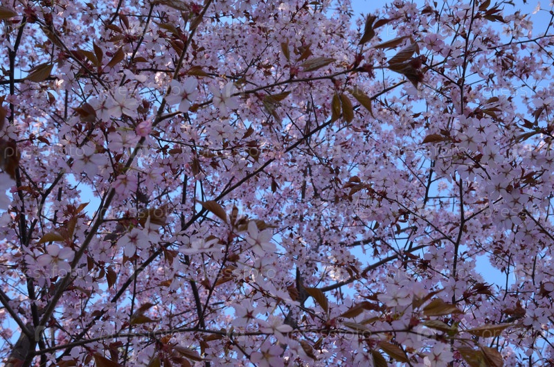 Ветка цветущей вишни (сакуры) на фоне голубого неба в Ботаническом саду Петра Великого в Санкт-Петербурге