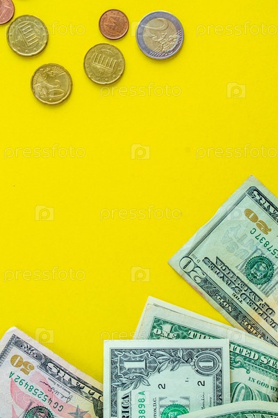 Долларовые банкноты и евромонеты на желтом фоне, вертикальный фон с пространством для копирования