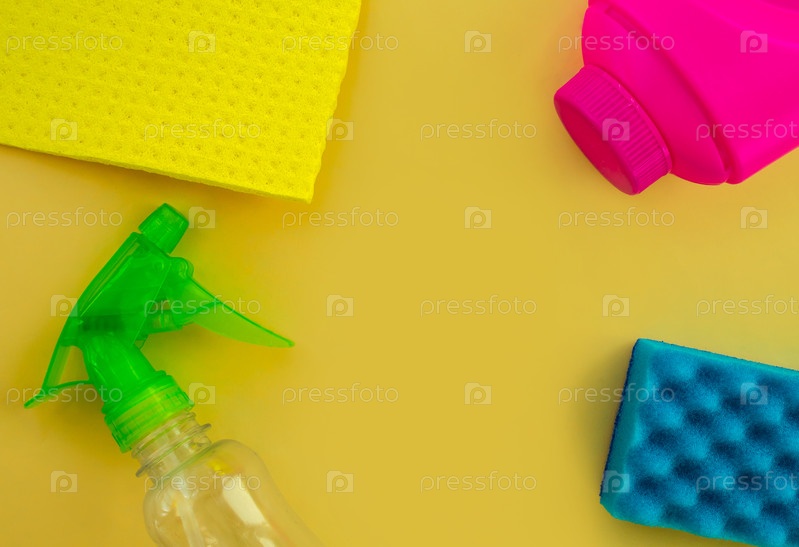 Уборка. Плоская раскладка бутылок с чистящим средством и губками на желтом фоне, пустое место в центре