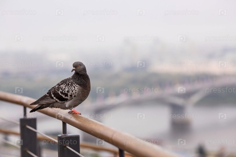 Дикий сизый голубь сидит на перилах на фоне моста через Волгу в Нижнем Новгороде