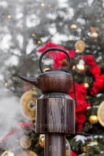 Большой самовар на Тверской площади. Уличный туристический магазин с сувенирами на продажу. Россия, Москва