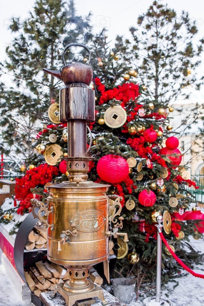 Большой самовар на Тверской площади. Уличный туристический магазин с сувенирами на продажу. Россия, Москва