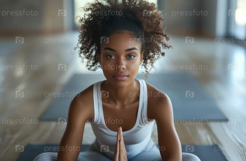 Женщина в позе йоги, сидящая в позе лотоса, выглядит спокойной и сосредоточенной в ярко освещенной студии