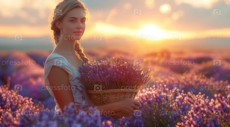 Женщина держит корзину с цветами лаванды в поле на закате, спокойная и умиротворяющая атмосфера