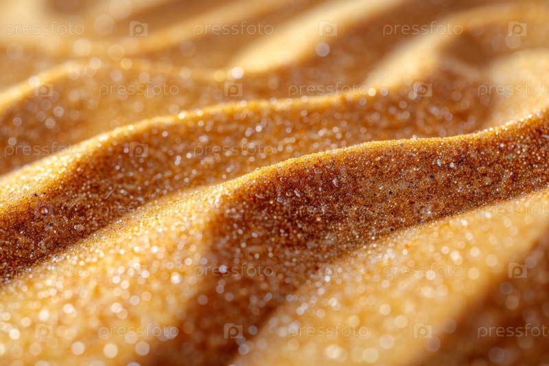 Крупный план золотистого песка с детализированной рябью и завитками, сверкающего на солнце
