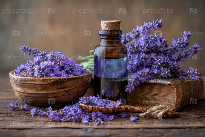 Стеклянная бутылка эфирного масла лаванды со свежими цветами лаванды в миске на деревенском столе