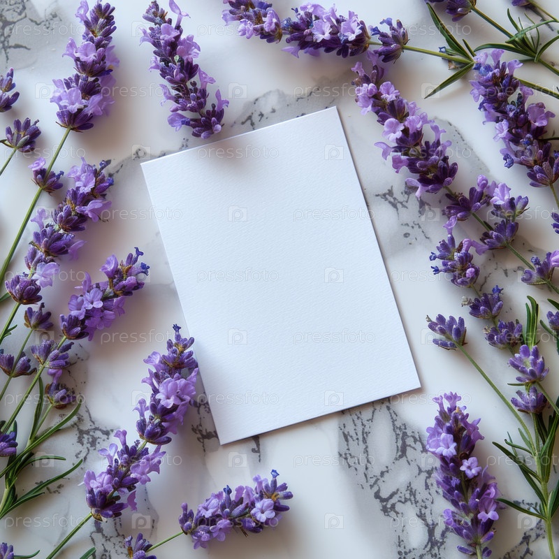 Чистая белая карточка на мраморной поверхности, окруженная цветами лаванды, идеально подходит для приглашений или записок