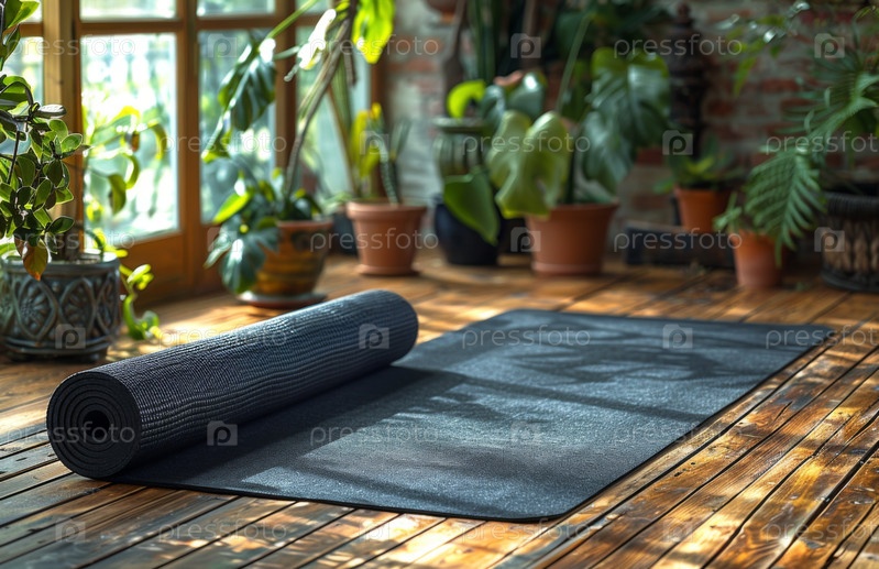 Черный коврик для йоги на деревянном полу, окруженный растениями в горшках в светлой и спокойной комнате