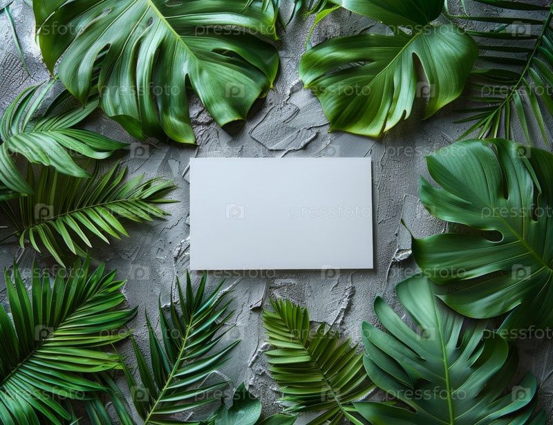 Макет пустой белой открытки на текстурированном бетонном фоне с сочными зелеными тропическими листьями