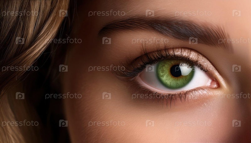 Крупный план зеленого человеческого глаза, окруженного ресницами, и частично детализированного лица, освещенного для естественного вида