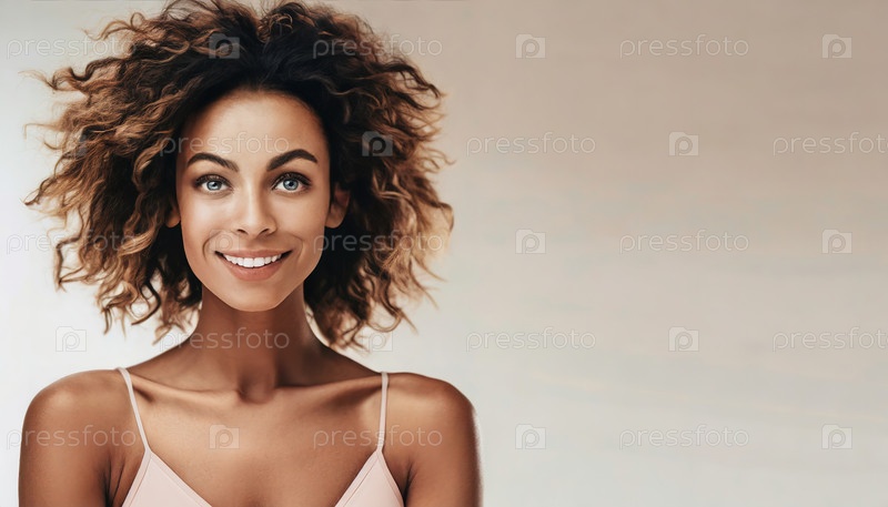 Улыбающаяся женщина с натуральными вьющимися волосами, одетая в пастельно-розовый топ, на мягком нейтральном фоне в помещении