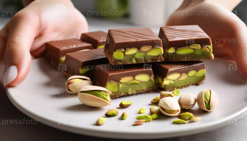 Тарелка с шоколадными фисташковыми квадратиками, разбросанными по всей поверхности, которую держат в руках. Плитка шоколада «Дубай» с орехами и зеленой начинкой Катаифи