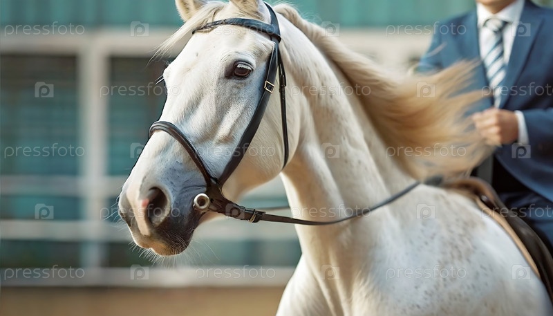 Крупный план белой лошади с развевающейся гривой и черной уздечкой, передающий ее красоту и элегантность в движении