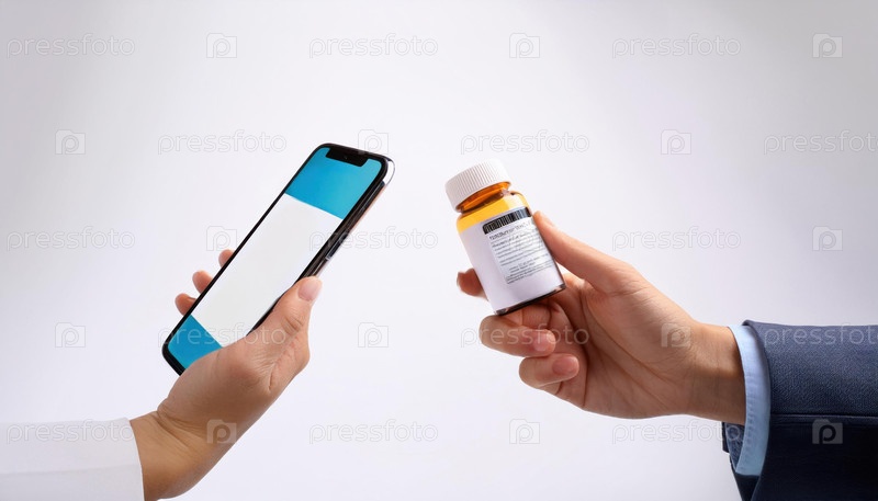 Врач держит в одной руке смартфон и флакон с лекарством, а в другой — мужчину, символизирующего цифровые решения в здравоохранении