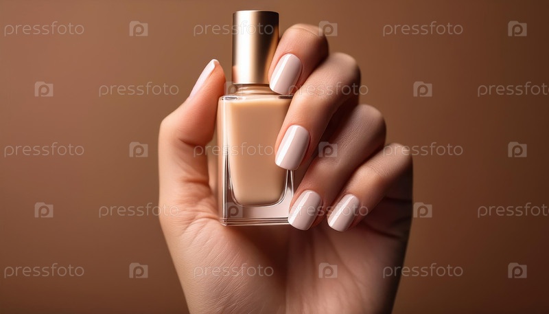 Рука держит флакон бежевого лака для ногтей с идеально ухоженными ногтями и простым фоном цвета мокко-мусс