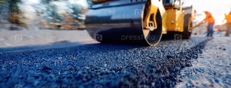 Каток выравнивает свежеуложенный асфальт во время дорожного строительства, подчеркивая текстуру поверхности