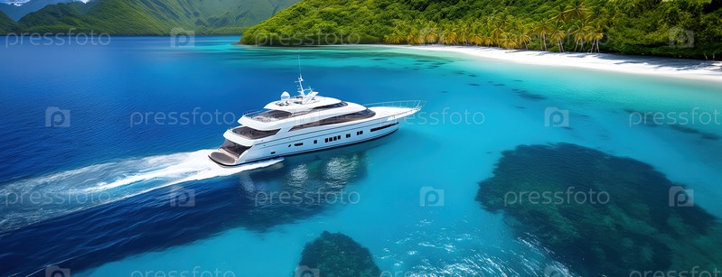 Роскошная яхта плывет по кристально чистой бирюзовой воде недалеко от тропического острова с белым песчаным пляжем и зеленым лесом в солнечный летний день