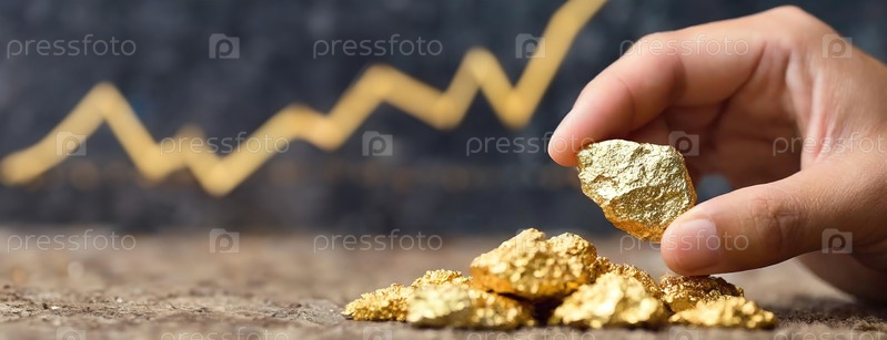 Крупный план золотых самородков на фоне графика финансового роста