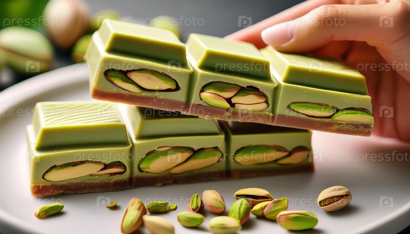 Крупный план плитки шоколада «Дубай» с катаифи и цельными фисташками, красиво оформленными разбросанными вокруг орехами
