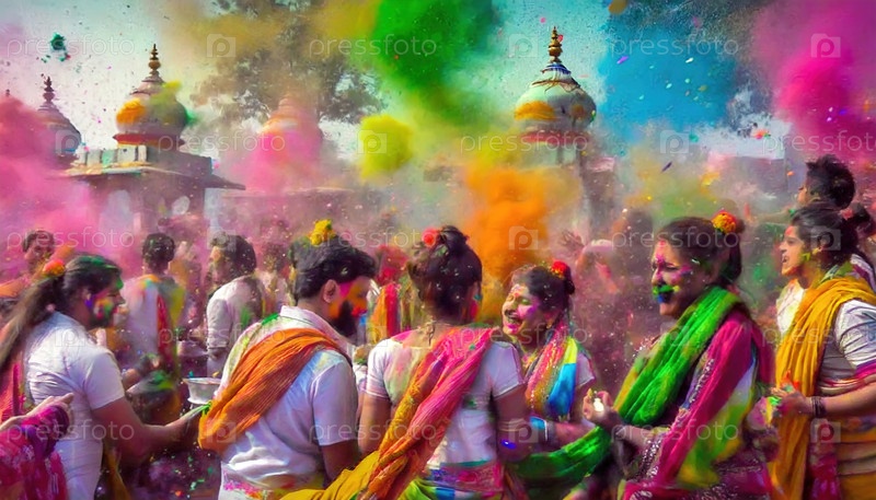 Яркое празднование с разноцветной пудрой на праздничном фестивале Холи на открытом воздухе