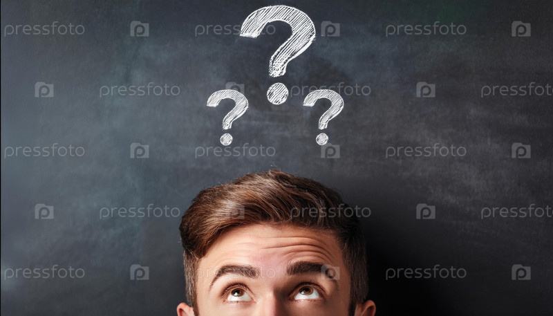 Молодой человек с короткими каштановыми волосами смотрит на доску, на которой темным мелом нарисованы три больших вопросительных знака