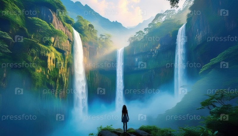 Женщина стоит на краю скалы, глядя на три высоких каскадных водопада, окруженных пышными зелеными джунглями и туманом