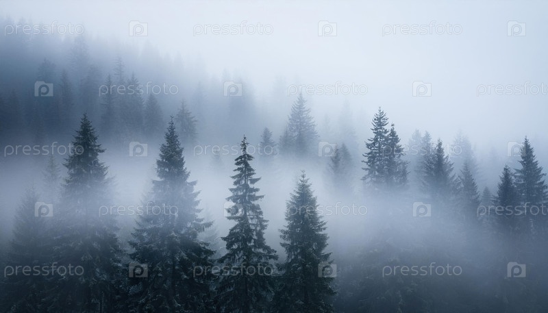 Туманный сосновый лес с густым туманом, покрывающим деревья, создающим атмосферный и угрюмый пейзаж