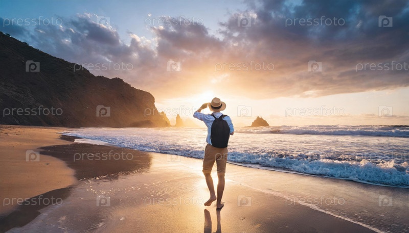 Мужчина в соломенной шляпе идет по пляжу на закате, волны разбиваются, а горизонт заполняет золотой свет