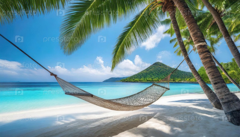 Пустой гамак качается между пальмами на белом песчаном пляже с видом на бирюзовые воды океана