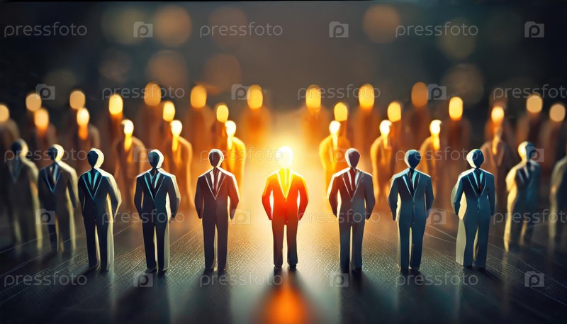 Группа деловых людей в официальных костюмах, стоящих в строю, один из которых светится теплым светом, олицетворяя лидерство, индивидуальность и успех