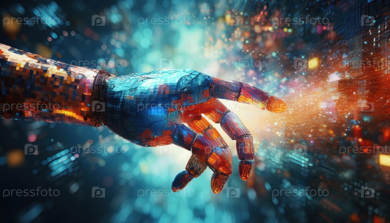Роботизированная рука тянется, чтобы коснуться светящихся частиц в цифровой киберсреде