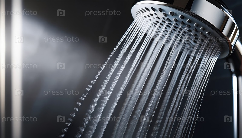 Крупный план современной душевой лейки, распыляющей воду в темной, стильной ванной комнате