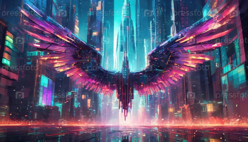 Пара механических крыльев распахивается в центре светящегося киберпанковского городского пейзажа