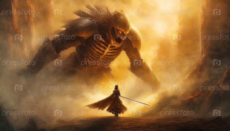 Воин противостоит огромному демону в огненных доспехах в туманной, светящейся пещере, наполненной пылью и жаром