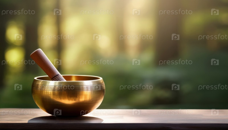 Золотая поющая чаша и молоточек, размещенные на деревянной поверхности в залитом солнцем лесу для спокойной медитации
