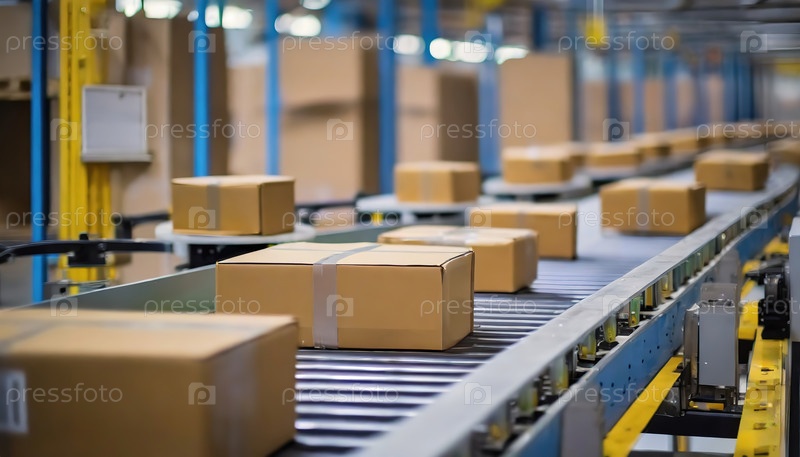 Оживленный конвейер на складе, заполненный запечатанными картонными упаковками, которые транспортируются, символизируя логистику и доставку