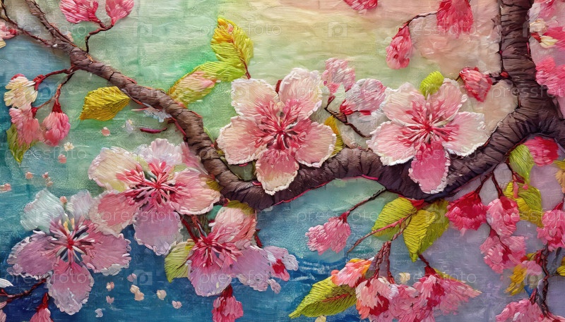 Яркая картина цветущей вишни с розовыми цветами, распускающимися на ветвях на фоне пастельного неба и воды