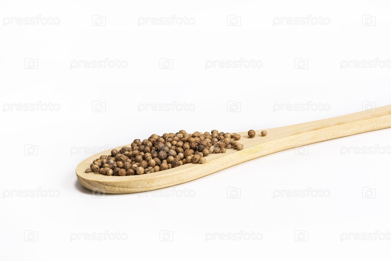 Семена специй кориандр на деревянной ложке на белом фоне. Изолированный