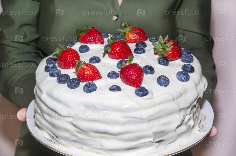 Женщина в зеленом платье держит большой белый домашний торт с клубникой и черникой