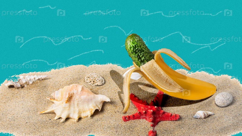 Концепция пляжного отдыха. Загорелый огурец в банановой кожуре лежит на песчаном пляже с ракушками и морскими звездами. Творческий взгляд на морской отдых. Творческая сцена