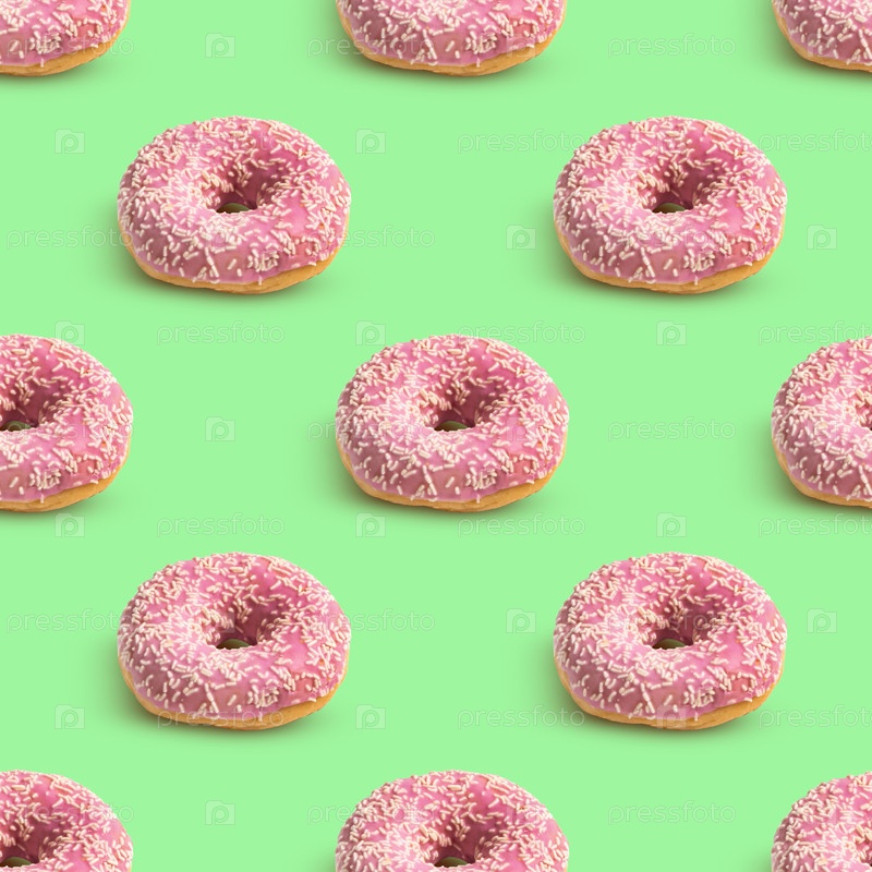 Повторяющийся узор из розовых пончиков на зеленом фоне